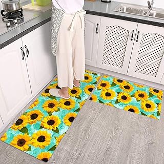 QIYI キッチンラグとマット2枚セット 滑り止め 洗濯可能 ランナーラグ キッチン床用 疲労防止 ホームオフィス シェフ用 快適 スタンディングマット 幅17インチ x 長さ29インチ + 幅17インチ x 長さ47インチ - 青にひまわり