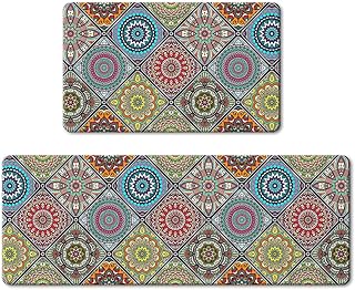 QIYI キッチンラグ 2ピース 抗疲労フロアマットセット PVCレザー 防水ランナーラグ オフィススタンディングマット フォームクッション入り快適ドアマット 幅17インチ x 長さ29インチ + 幅17インチ x 長さ47インチ - エスニックトラディショナルパターン