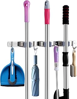 Yoocylii ほうきモップホルダー 壁取り付け ステンレススチール ツールハンガー オーガナイザー ホーム キッチン 庭 ガレージ ランドリー 整理 収納 3ラック 4フック グレー